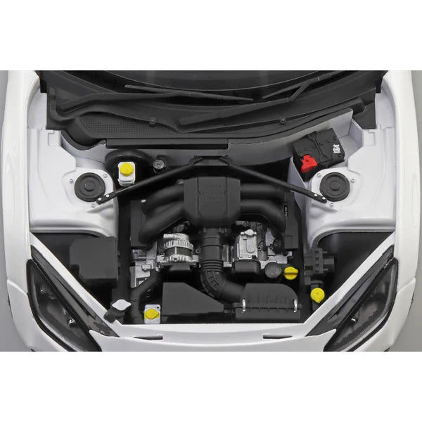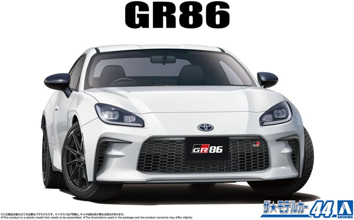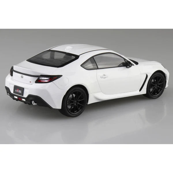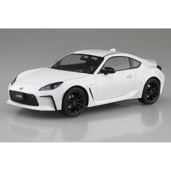 Aoshima presents the 2021 Toyota ZN8 GR86 as a newly molded plastic model kit, featuring a fully detailed engine reproduction. The kit includes genuine aluminum wheels and offers two options for vehicle height. Taillights are crafted in clear and clear red materials, while window frame masking stickers and decals are provided to ensure precise and authentic assembly.