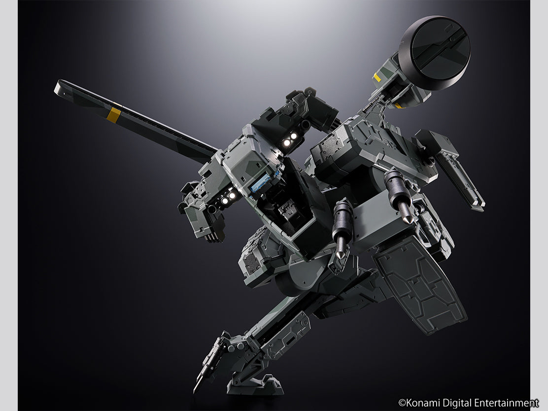 Articulated die-cast figure of the iconic bipedal tank from the Metal Gear series, featuring deployable armor that reveals an internal frame, realistic camouflage, and a large railgun. Designed for dynamic posing with wide leg articulation and a stable display base. Specifications Height: approximately 17.5 cm Railgun length: approximately 26 cm Materials: ABS, die-cast alloy LED lighting in the head Armor-deployment feature exposes internal frame and die-cast parts Independently movable die-cast spikes Multiple leg joints for a wide range of motion Dedicated base with two support joints for leaning-forward poses Set includes: main figure, special base set Power: requires three LR44 batteries (test batteries included)