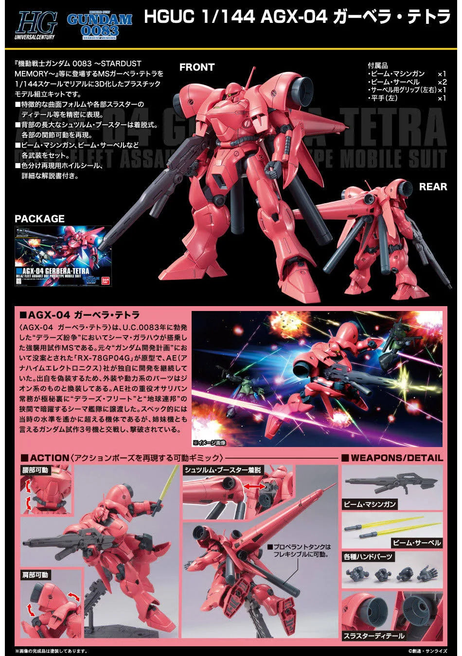 The Gerbera Tetra from Stardust Memory is finally here in a modern kit! It features all the standard HG fare, like full articulation and poseability as well as its array of weapons as seen in the show. This kit includes the classic beam machine gun as well as several pairs of interchangeable hands, so you can pose it however you like. Retailers.