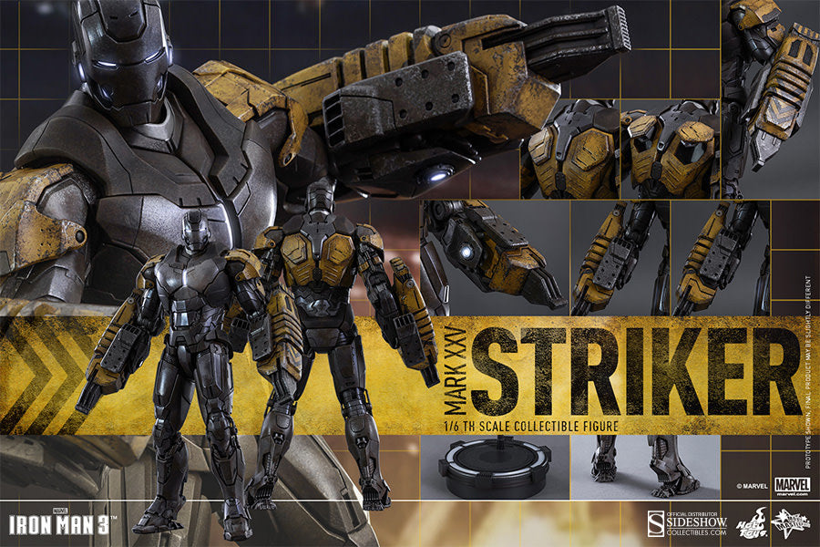 As seen in Iron Man 3, Tony Stark has built the Striker (Mark XXV), also known as the Heavy Construction Suit. This suit is designed for assisting in heavy ,  featuring the suit's distinctive design with the pair of Pneumatic Hammers, special paint  * Condition 9/10