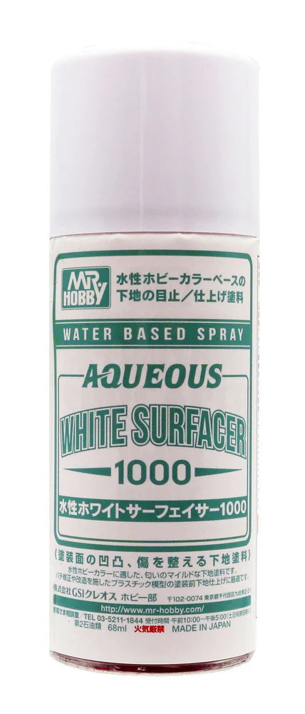 Mr. Aqueous White Surfacer 1000 B-612 is a renowned product used to reduce the appearance of small scratches and create a smooth surface for painting. As a primer, it promotes stronger paint adhesion and offers a neutral color palette to eliminate any potential influence from the original subject's hue. Available in a range of particle sizes, with higher numbers indicating finer particles, the water-based Aqueous version has a less chemical scent compared to the regular Mr. Surfacer.