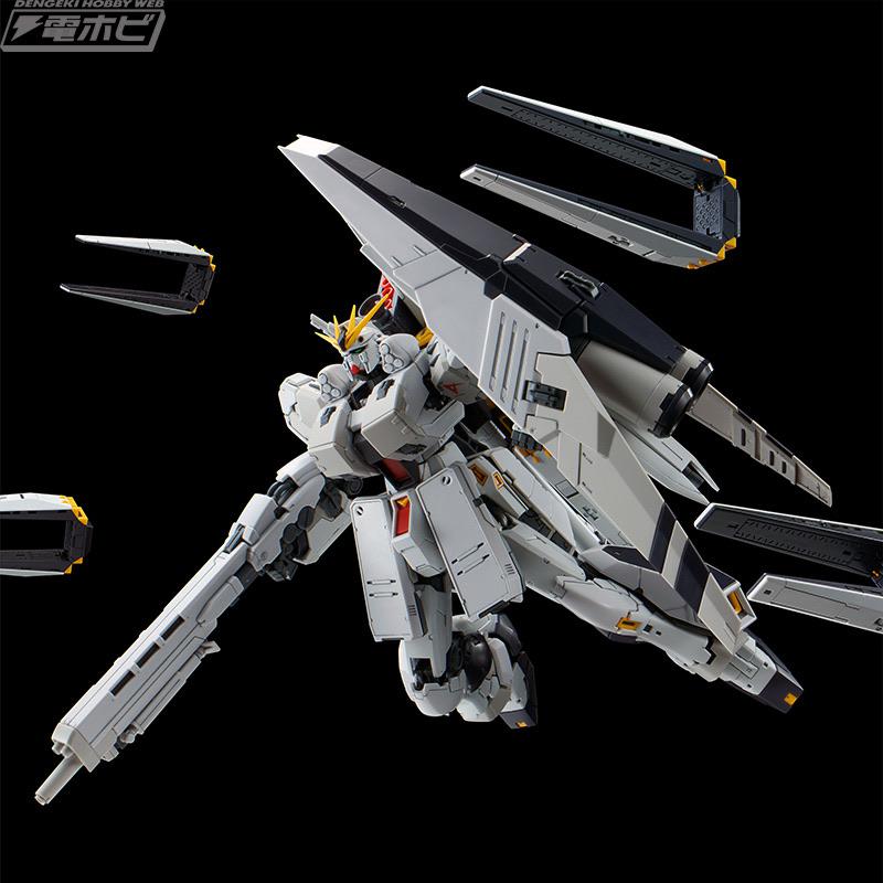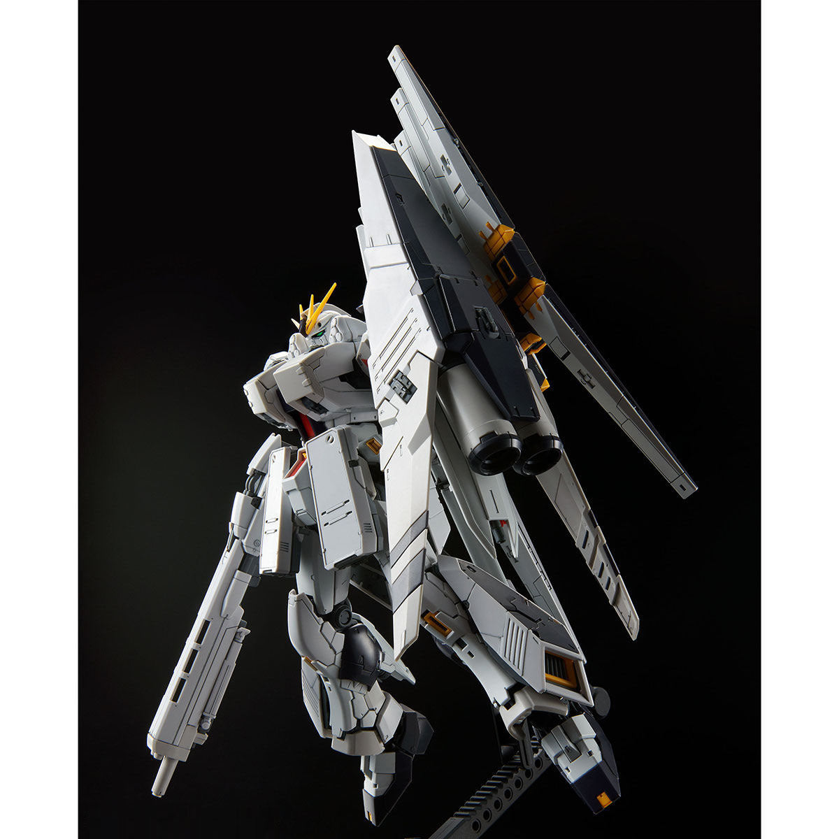 CHEST ARMOR UNIT The chest armor unit is integrated with shoulder missile launcher. It is also equipped with deployment gimmick on its front armor to reveal the missile launcher inside it. HYPER MEGA RIFLE HWS nu Gundam will not be completed without its Hyper Mega Rifle. It is molded in multiple parts for it to be able to adapt some expansion and contraction gimmick. LEG THRUSTER UNIT The leg armors are extended with huge thruster units, to help the balance of its weight distribution, and to give the HWS nu Gundam a boost in space combat. HIGH MEGA SHIELD Given its huge appearance, the high-mega shield contains light weight parts to support the balance of its unit. The barrel boosters can also be extended to a more dynamic presentation.
