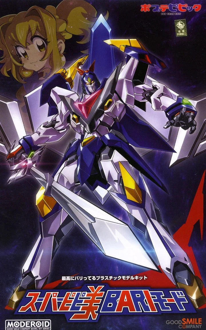 From the anime series "POP TEAM EPIC" comes a fully articulated MODEROID plastic model of Super Pipimi BARI Mode! The model's BARI sculpt and articulation allows you to recreate all kinds of BARI poses. Both a standard and forced-perspective version of the great sword Lord of Calamity are included, along with the Valiant Cannon and missile pods. A face part with mask partially removed is also included. It started off as a silly concept, but make no mistake, this has become a truly high-quality, full-spec plastic model kit! The plastic model is primarily made of PS&ABS plastic, and features five colors of runners (white, red, yellow, blue and gray) and stickers, making it easy to totally recreate the mecha with a simple assembly! The kit also includes a "Sushi Popuko" figure! *Sushi Popuko comes with the kit unpainted. Eye decals are included.