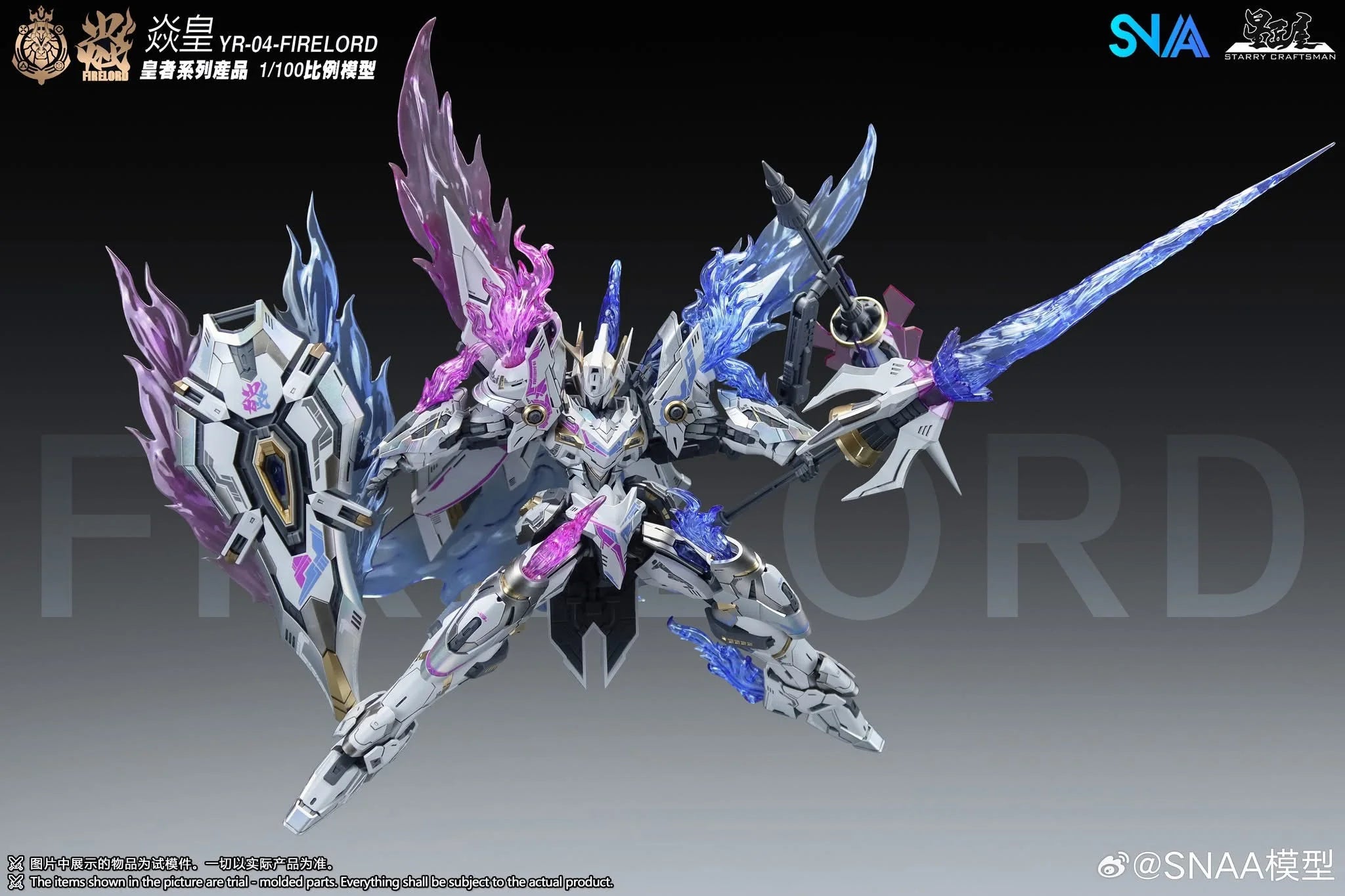 The SNAA 1/100 YR-04 Fire Lord Particle Awakening Armament (F.P.A.A.) is a highly detailed, third-party plastic model kit from the Royal Series featuring a flame-inspired design. It includes extensive weaponry, such as large lances and swords with effect parts, plus mechanical arm attachments. The kit is known for improved stability, high-quality plated parts (gold/silver), and a complex, rewarding build suitable for collectors.