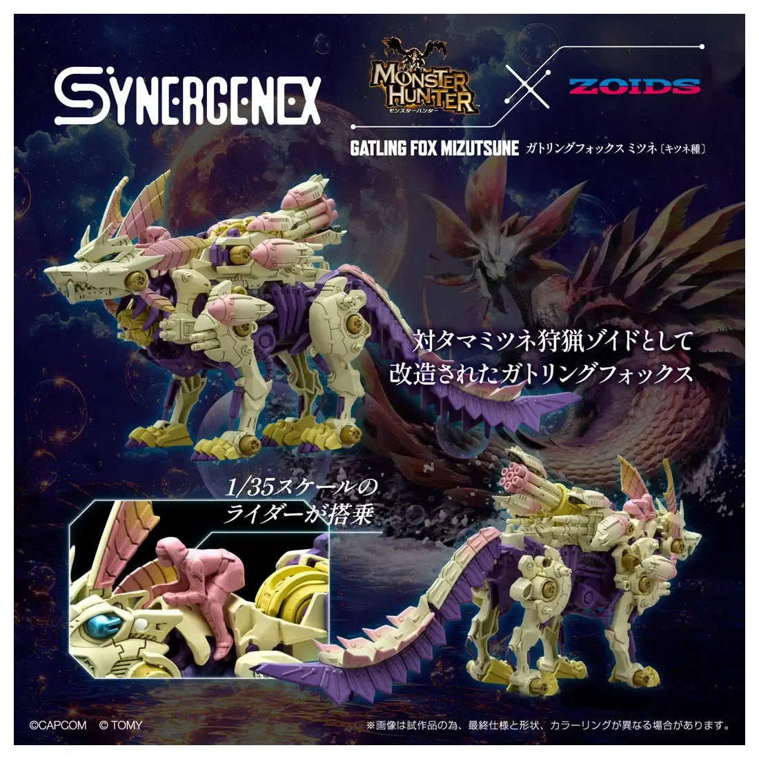 The Gatling Fox Mizutsune is a spectacular crossover between Monster Hunter and Zoids! This special variant comes equipped with weaponry inspired directly , with gradient paint, rider figure, and enhanced head, back, and tail armor.